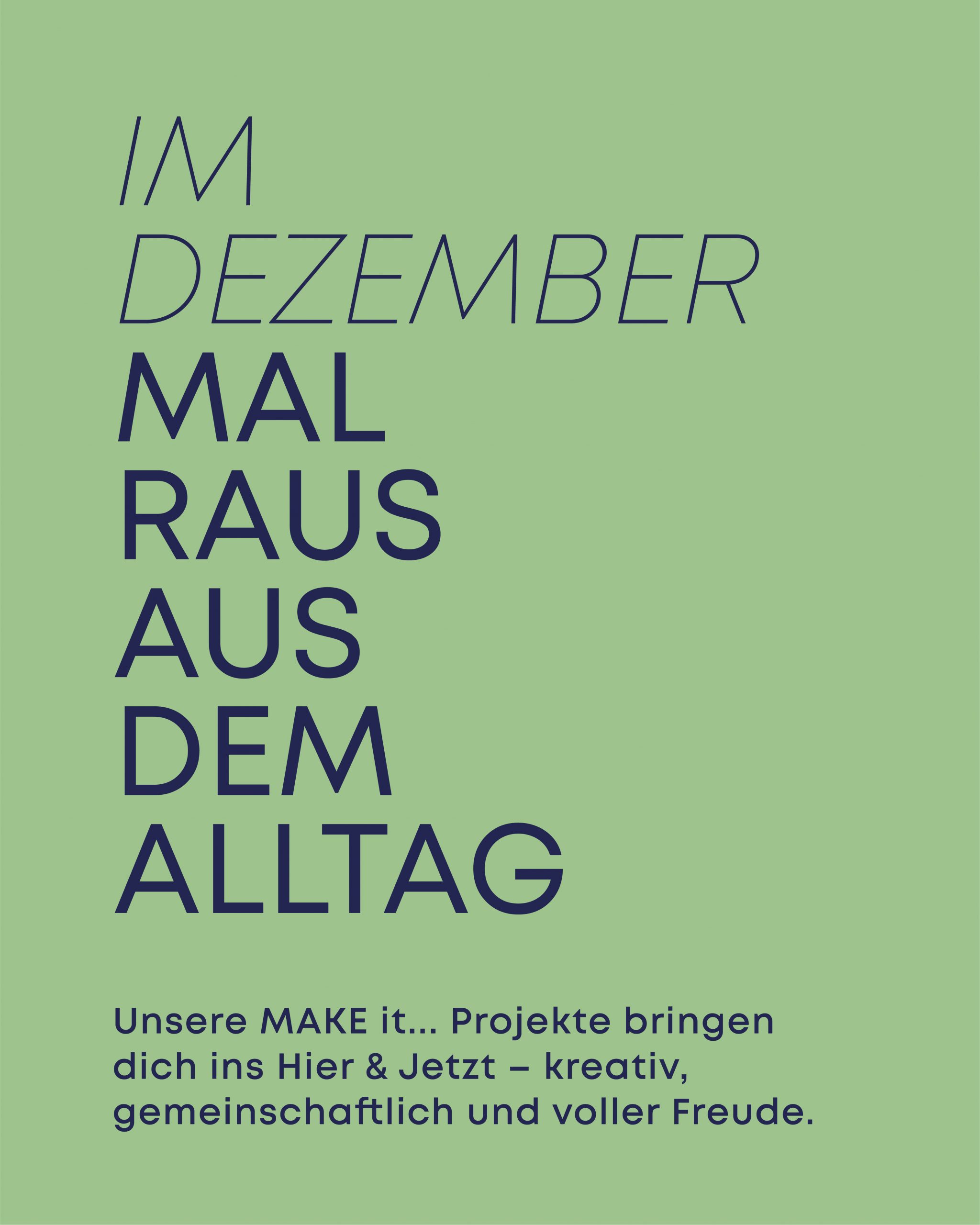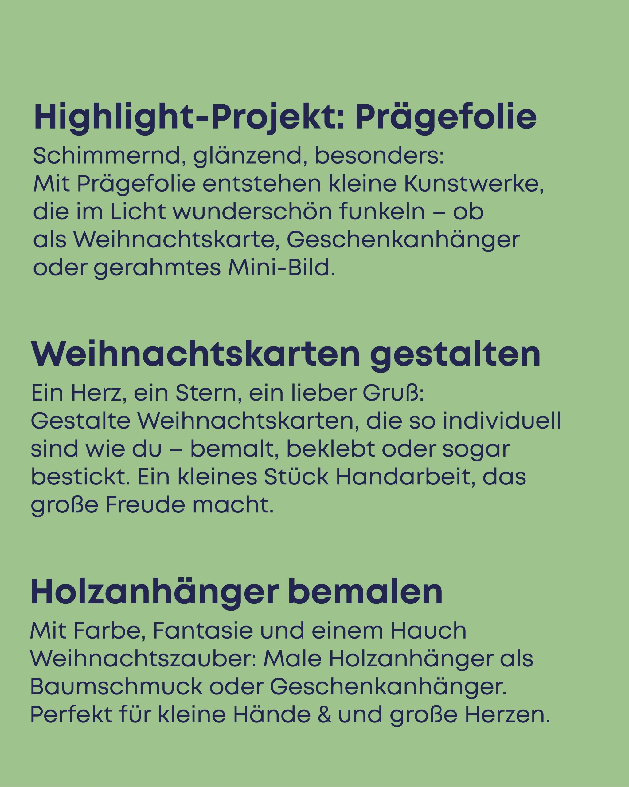 Fernab vom Alltagstrubel gemeinsam kreativ werden, lachen und genießen. Ob aus Holz, Papier, Wolle oder Farbe – in unserer Weihnachtswerkstatt entstehen kleine und große Werke mit Herz: bunte Bilder, fantasievolle Deko oder liebevoll gestaltete Geschenke. Hier wird nicht nur gebastelt, sondern mit Freude geschaffen – selbstgemacht, achtsam und mit ganz viel Liebe zum Detail.